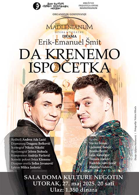 „Da krenemo ispočetka“ naziv je pozorišne predstave beogradske Opere i teatra „Madlenianum“ koju Dom kulture „Stevan Mokranjac“ organizuje u saradnji sa Društvom prijatelja opere „Madlenianum“ u utorak, 27. maja 2025. od 20 sati.