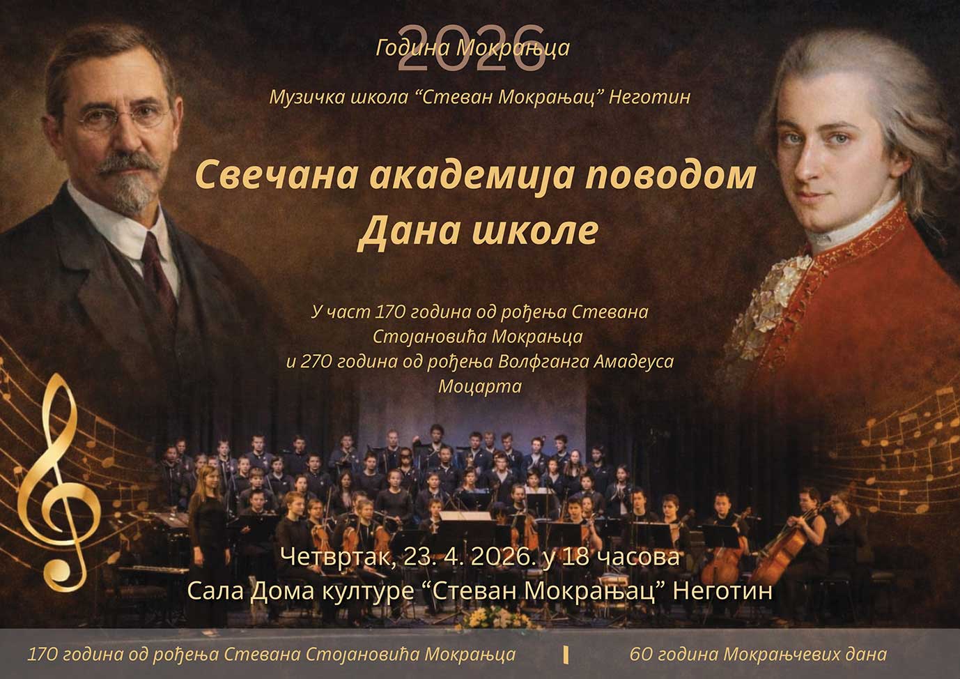 Музичка школа „Стеван Мокрањац“ у Неготину обележиће Дан школе свечаном академијом која ће бити одржана у четвртак, 23. априла 2026. године, са почетком у 18 часова, у сали неготинског Дома културе.