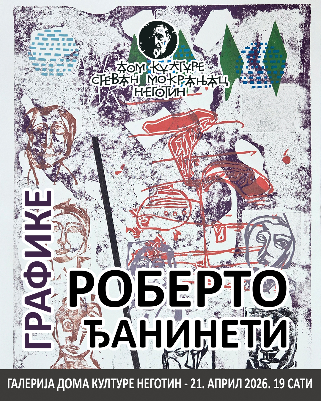 Дом културе „Стеван Мокрањац“ Неготин позива љубитеље ликовне уметности на отварање изложбе графика италијанског уметника Роберта Ђанинетија, које ће бити одржано у галерији Дома културе у уторак, 21. априла 2026. године, са почетком у 19 сати.