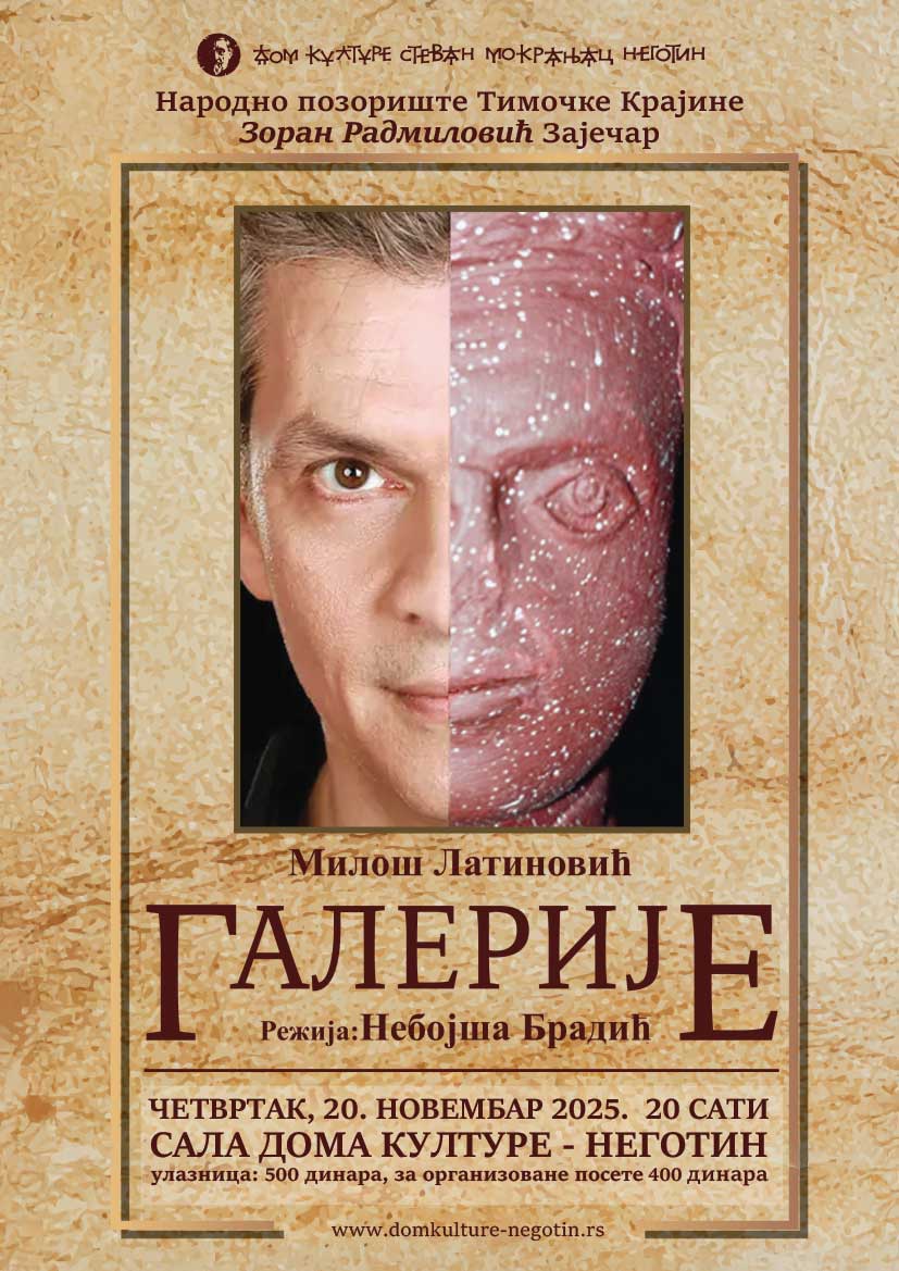 Dom kulture „Stevan Mokranjac“ u Negotinu ugostiće u četvrtak, 20. novembra 2025. godine u 20 časova, izuzetnu predstavu „Galerije“ u režiji, adaptaciji i scenografiji Nebojše Bradića. Predstava je nastala po tekstu Miloša Latinovića, premijerno je igrana 16. oktobra 2025. na otvaranju 34. Dana Zorana Radmilovića, a izvodi je ansambl Narodnog pozorišta Timočke Krajine „Zoran Radmilović“ iz Zaječara.