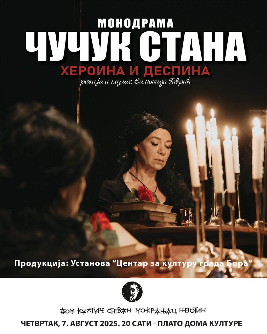 Na platou Doma kulture „Stevan Mokranjac“ u četvrtak 7. avgusta od 20 sati biće igrana monodrama „Čučuk Stana – heroina i despina“, u izvođenju Simonide Gavrić, koja je kompletan autor ovog pozorišnog komada.