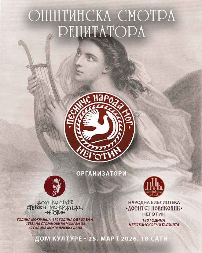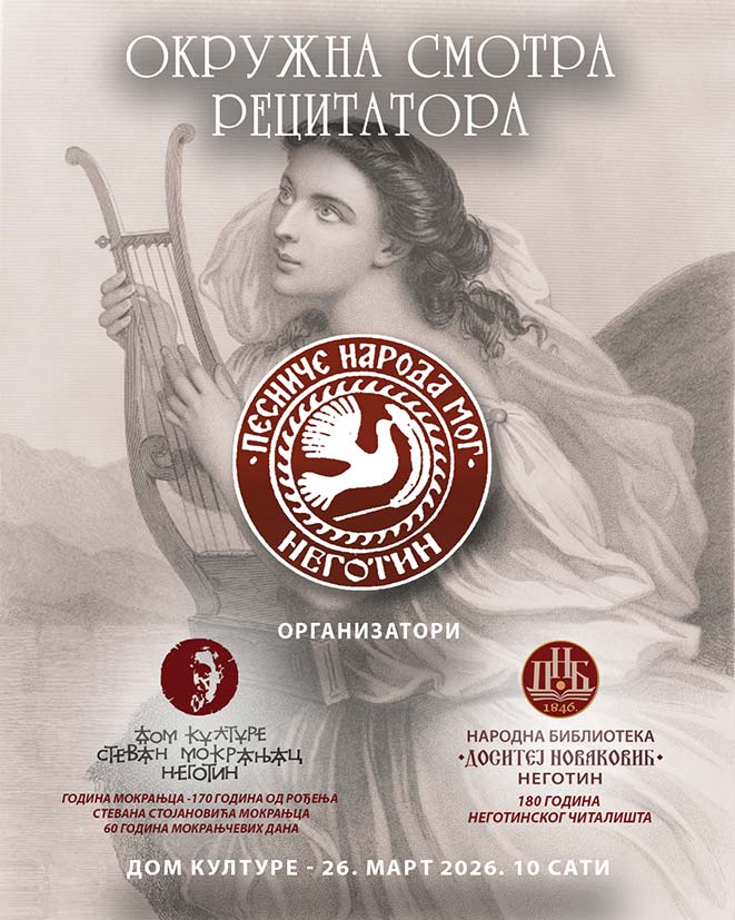 Дом културе „Стеван Мокрањац“, у сарадњи са Народном библиотеком „Доситеј Новаковић“, а под покровитељством Општине Неготин, организује Општинско такмичење рецитатора „Песниче народа мог“, које ће бити одржано у среду, 25. марта 2026. године, као и Окружну смотру рецитатора у четвртак, 26. марта.