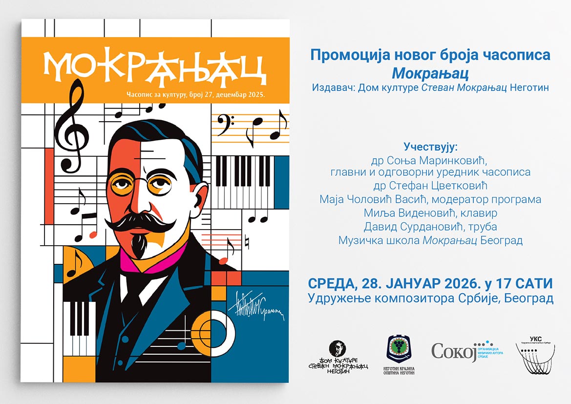 Дом културе „Стеван Мокрањац“ из Неготина представиће 27. број часописа за културу „Мокрањац“ у среду, 28. јануара 2026. године, са почетком у 17 сати,у просторијама Удружења композитора Србије.