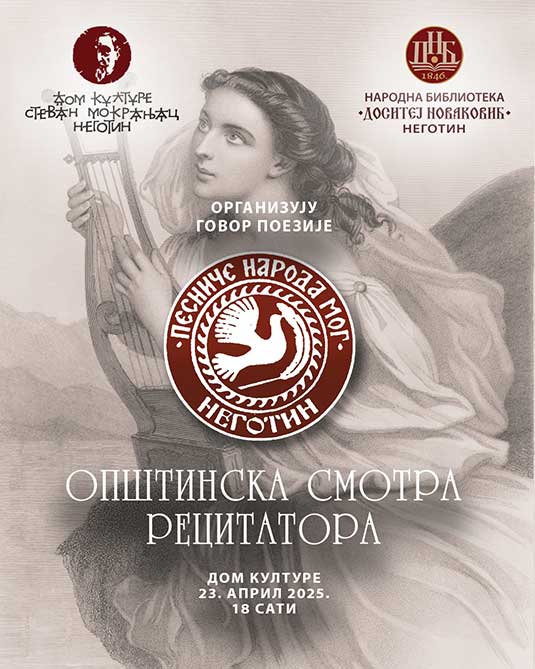 Дом културе „Стеван Мокрањац“, у сарадњи са Народном библиотеком „Доситеј Новаковић“ и под покровитељством oпштине Неготин, 23. и 24. априла 2025. године, организује општинску и окружну смотру рецитатора под називом „Песниче народа мог“.Oпштинска смотра рецитатора најављена је за 23. април од 18 сати у сали Дома културе у Неготину и окупиће 38 учесника у три категорије. Највише пријављених такмичара је у млађем узрасту (од I – IV разреда основне школе) – 22, средњи узраст (од V – VIII разреда основне школе) окупиће 12, док ће се у старијем узрасту (средњошколци, чланови КУД-а, Удружења…) за титулу најбољег рецитатора надметати четворо такмичара.