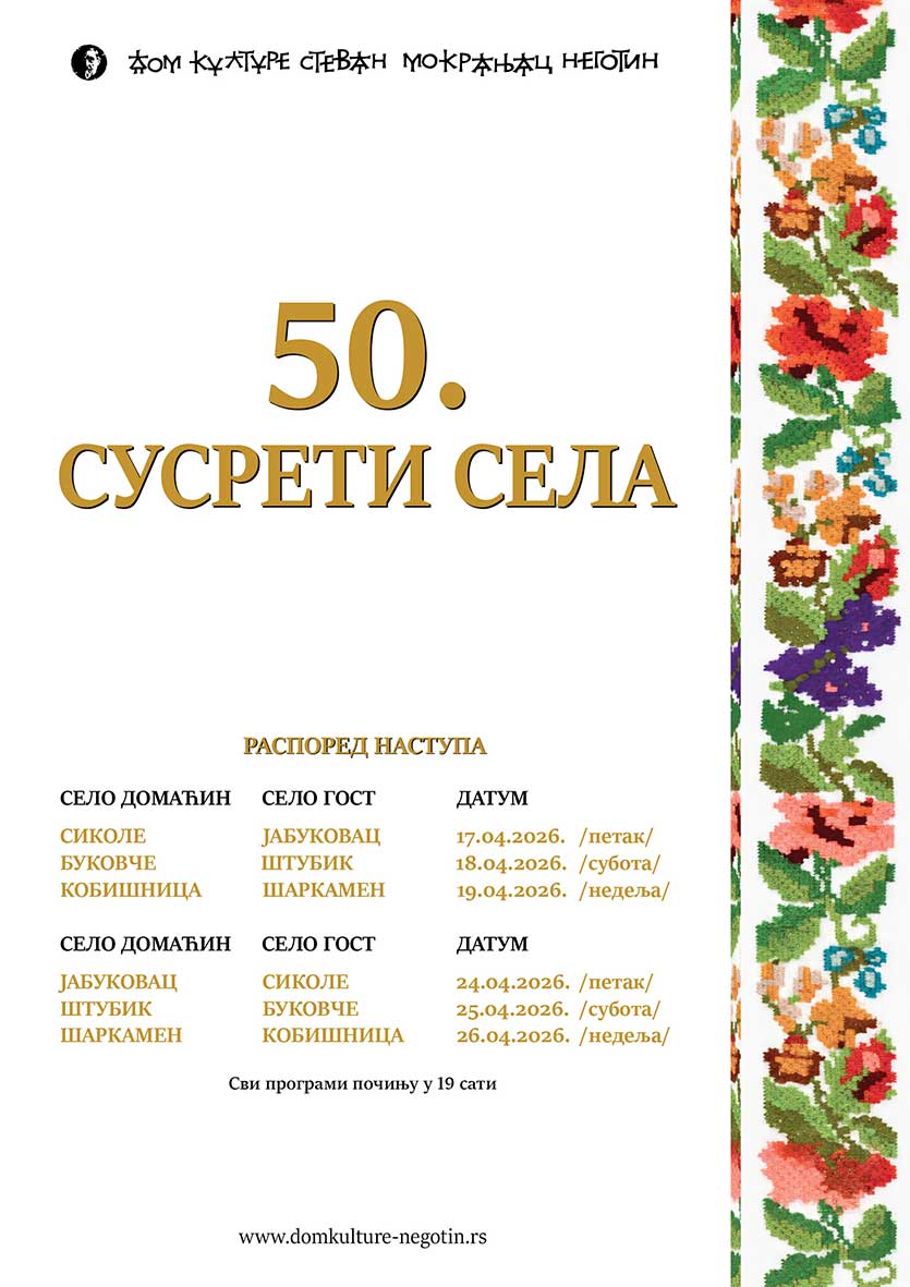 Дом културе „Стеван Мокрањац“ Неготин организује јубиларне 50. Сусрете села општине Неготин, традиционалну манифестацију која негује културно наслеђе, обичаје и заједништво сеоских средина.